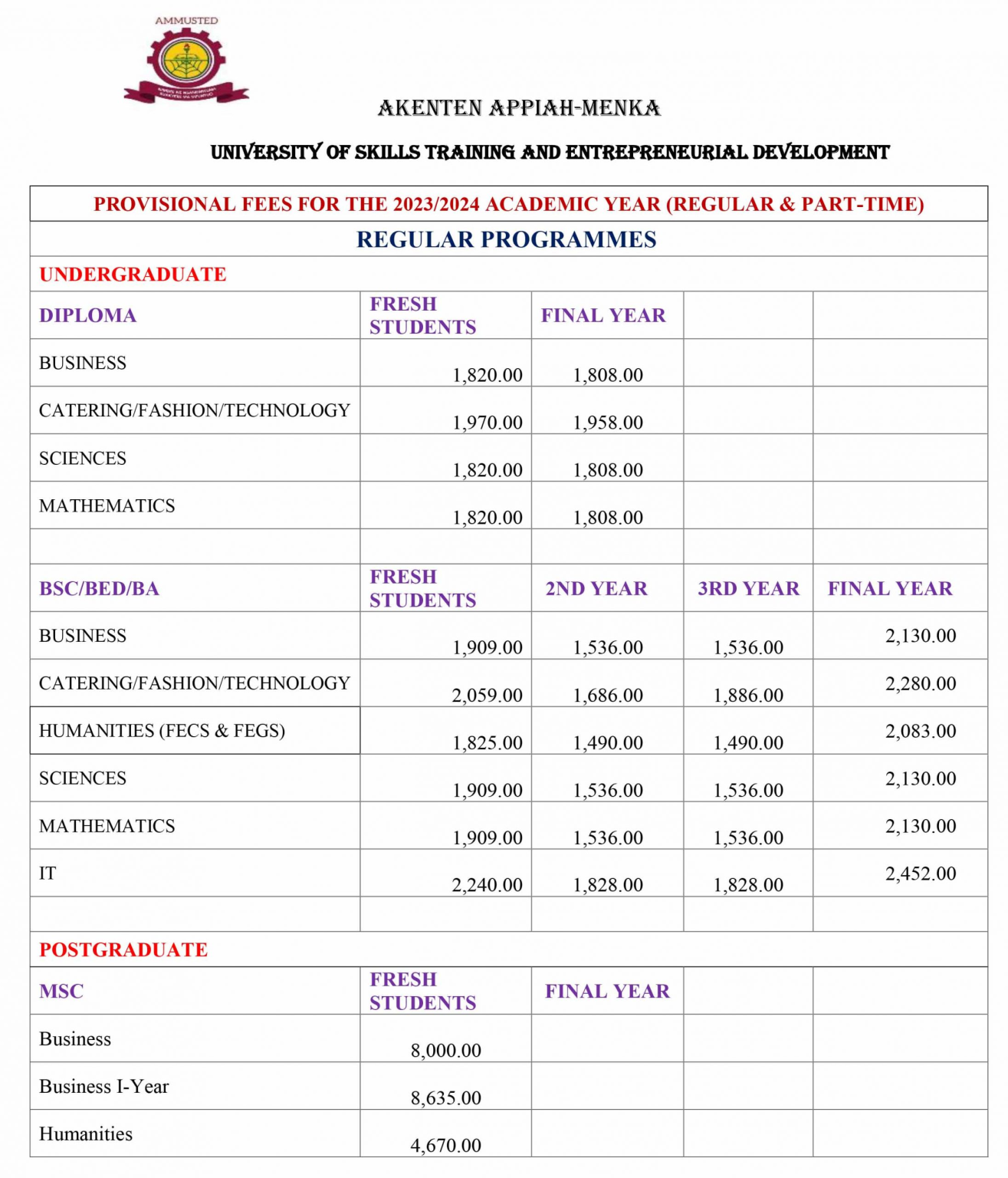The management of Akenten Appiah-Menka University of Skills Training and Entrepreneurial Development (AAMUSTED) has released the fee schedule For 2023/2024. The schedule is a table that gives the detailed school fees to be paid by Fresh and continued students of AAMUSTED for the 2023/2024 academic year. Students of AAMUSTED undertaking both regular and part-time courses can find below the detailed fee schedules for the 2023/2024 academics.