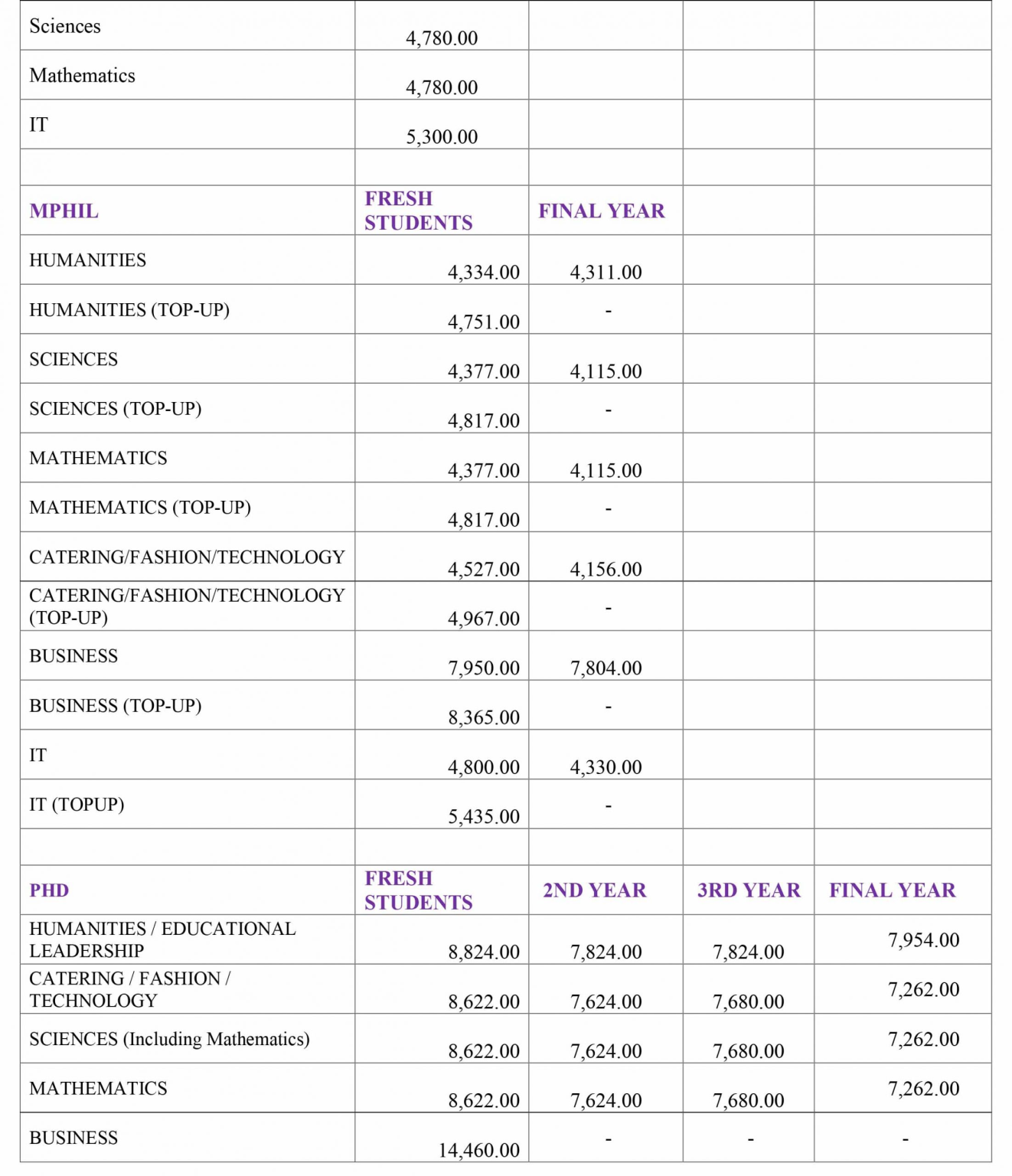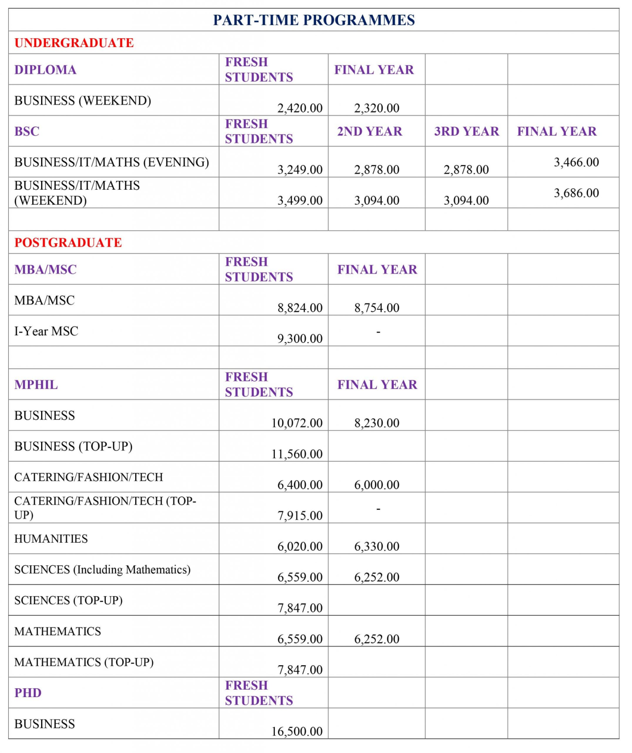 Included in all postgraduate programme fees are GRASSAG dues of GHc 75 and GHc 65 for freshers and continuing students, respectively.