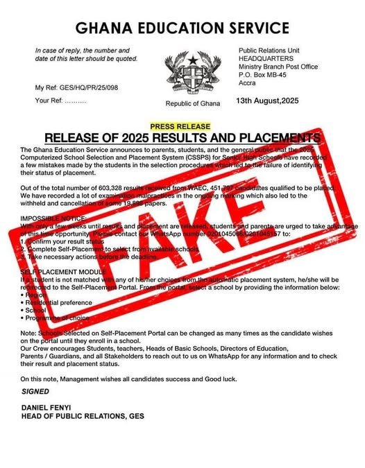 As the 2025 Basic Education Certificate Examination (BECE) draws closer to its official results release, misinformation and fake news have begun circulating on social media and messaging platforms. Some of these false reports claim that BECE results have already been released or provide unverified links for checking results. Parents, students, and guardians are strongly advised to ignore such claims.
