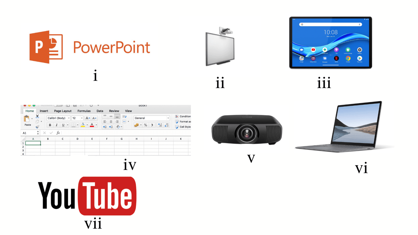 (a) Identify the educational ICT tools labeled I, I, II, IV, V, VI, and VIl below and state the general use of each.