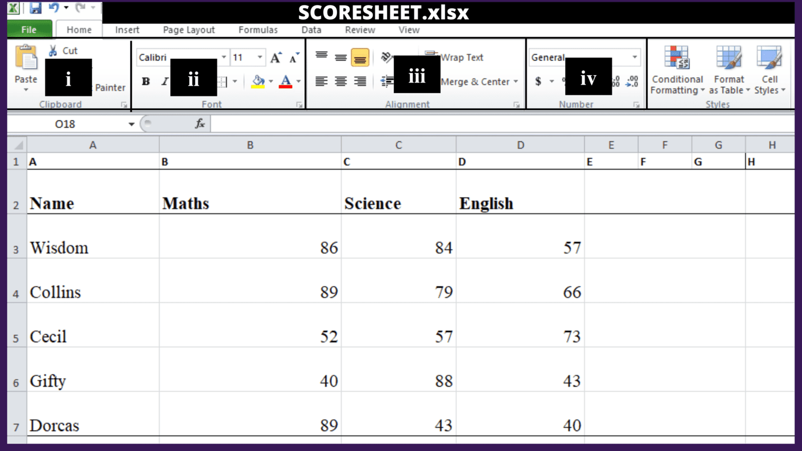 (vi) Write down two formulas that can be used to calculate Wisdom’s total scores in all three subjects using operators and cell references only.