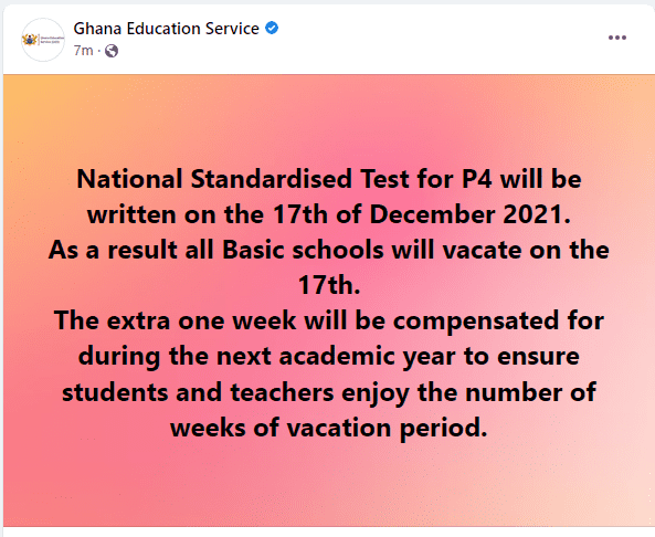 A social media update from the Ghana Education Service Page indicates that all Basic schools will vacate on the 17th December 2021.