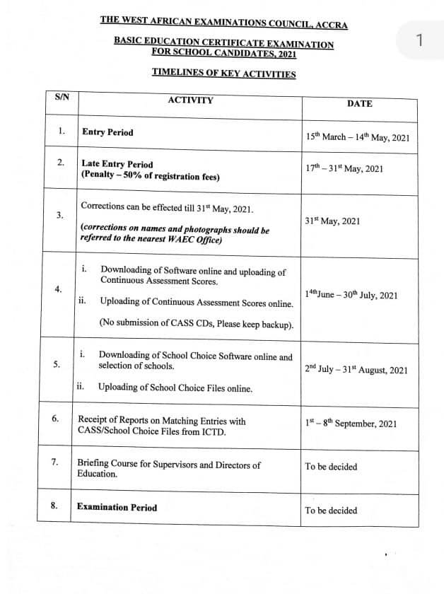 In order to ensure that the officials are adequately equipped to handle the registration processes effectively and efficiently, the WAEC has prepared the enclosed materials (audio/visual notes on BECE for school candidates, 2021 registration) and the timeline of key activities to facilitate the registration process.