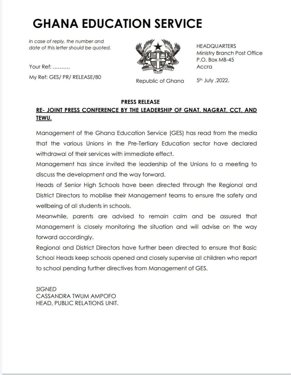Management of the Ghana Education Service (GES) has read from the media that the various Unions in the Pre-Tertiary Education sector have declared withdrawal of their services with immediate effect.