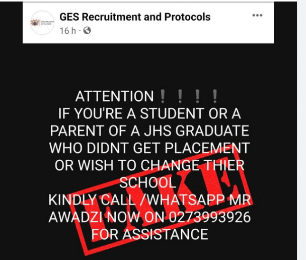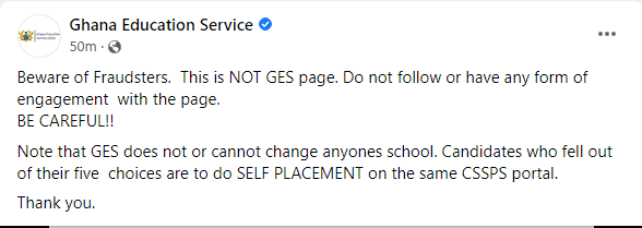 The above update was brought to the attention of GES and the management wishes to inform the general public to be careful of such pages. That GES does not or cannot change anyone’s school.