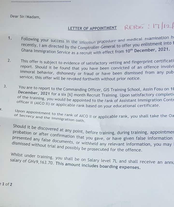 3. You are to report to the Commanding Officer, GIS Training School, Assin Fosu on 10th December 2021 for a six [6] month Recruit Training. Upon satisfactory completion of the training, you would be appointed to the rank of Assistant Immigration Controller officer Il (AICO Il) or applicable rank based on your educational certificate.
