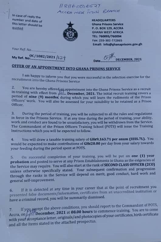2. You are hereby offered an appointment Into the Ghana Prisons Service a recruit in-training With effect from December 2021. The initial recruit training covers a period of nine (9) months during which you “‘ill learn the rudiments of the Prison Officers’ Work. You Will also be assessed for your suitability to be retained a Prison Officer.