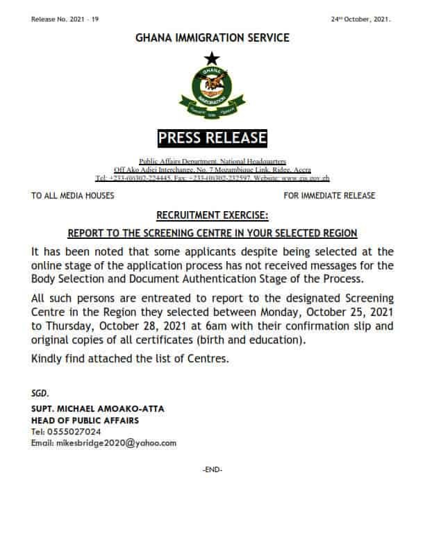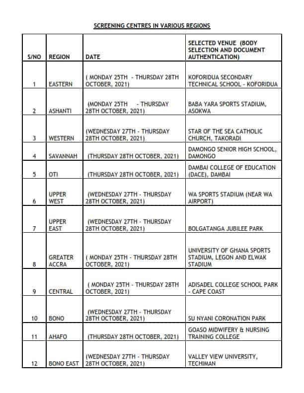 All such persons are entreated to report to the designated Screening Centre in the region the Selected between Monday, October 25, to Thursday, October 28, 2021, at 6 am with their confirmation slip and original copies of all certificates (birth and education).