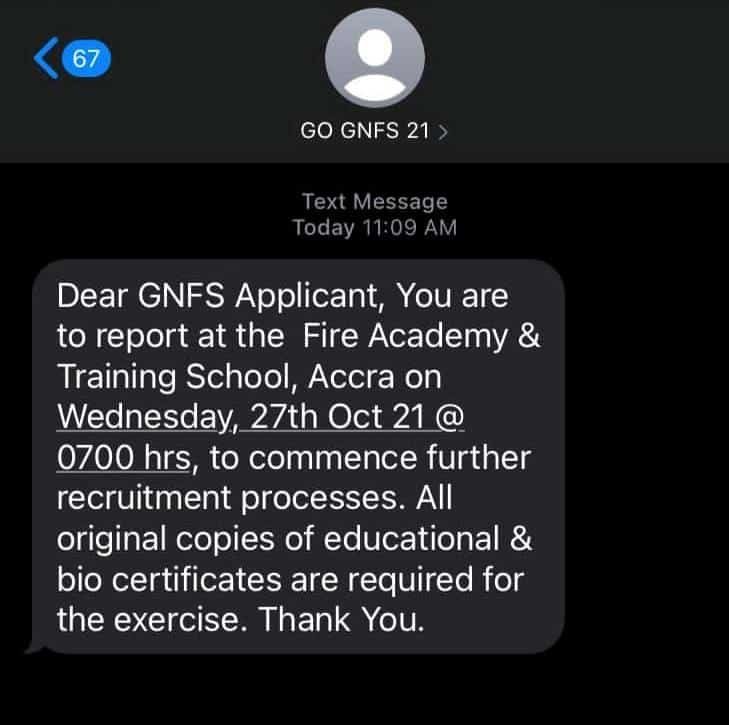 “Dear GNFS Applicant, you are to report to the Fire Academy & Training School, Accra on Wednesday, 27th Oct 21 @ 0700hrs, to commence further recruitment processes. All original copies of educational & bio certificates are required for the exercise. Thank You.”