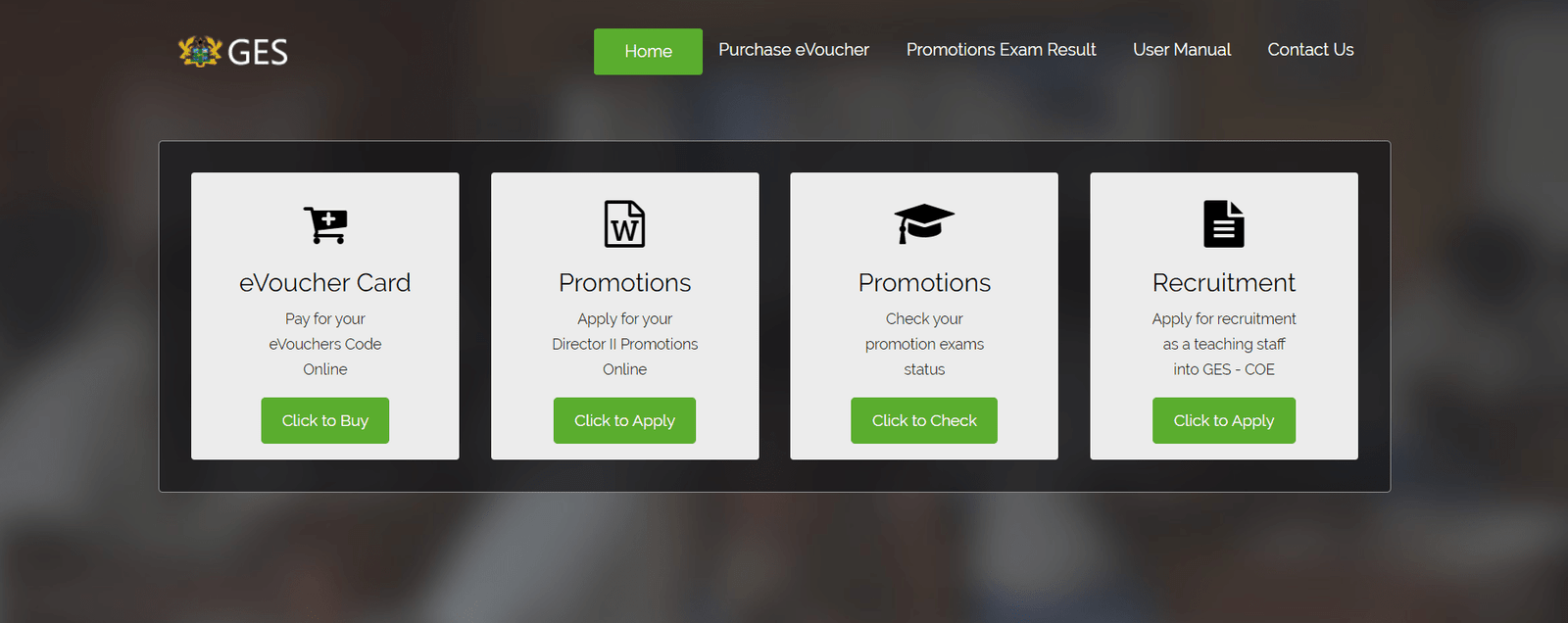 Once you are on the G.E.S recruitment portal, you’ll be displayed with different options. Click on eVoucher Card.