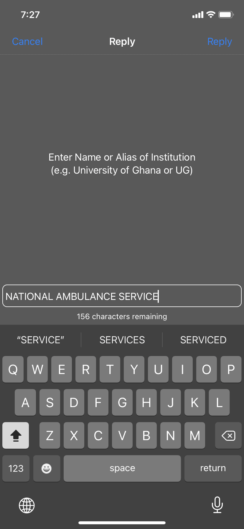 Enter the NAME or alias of Institution. That is NATIONAL AMBULANCE SERVICE