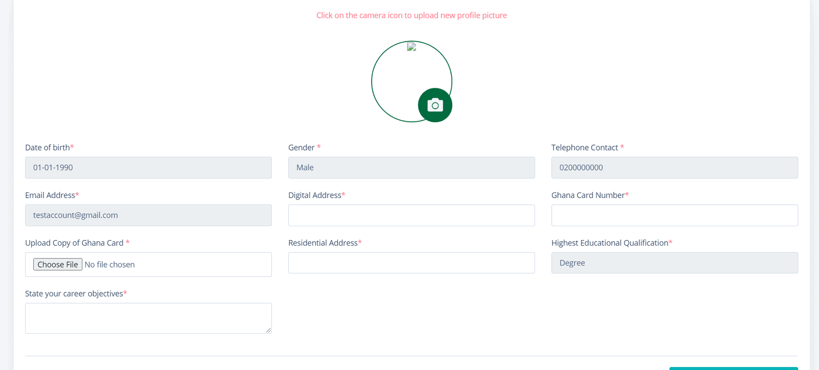 Upload Copy of Ghana Card: Click on the Choose File icon to upload a copy of the Ghana Card.