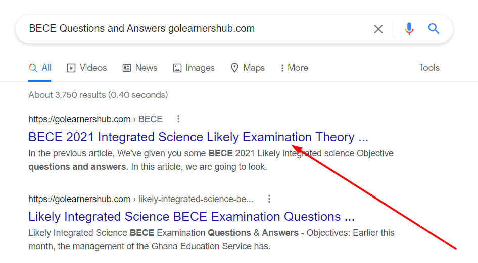 - You can also go to Google on your phone browser and search for BECE/WASSCE Questions and Answers golearnershub.com. Then click on the First Link That appears as shown on the screen below.