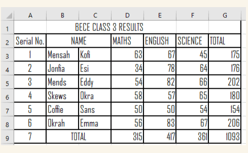 (Iii) Write down the cell range in which “BECE CLASS 3 RESULTS” was typed.