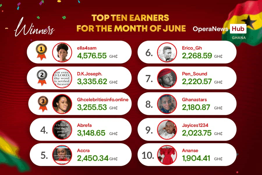 Below is the screenshot of the latest opera news hub payment to the top earners for June.