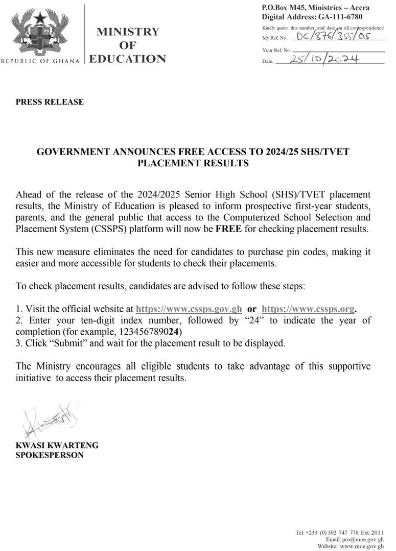 Ahead of the release of the 2024/2025 Senior High School (SHS)/TVET placement results, the Ministry of Education is pleased to inform prospective first-year students, parents, and the general public that access to the Computerized School Selection and Placement System (CSSPS) platform will now be FREE for checking placement results.