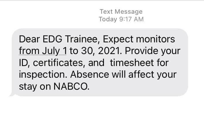 “Dear EDG Trainee, Expect monitors from July 1 to 30, 2021. Provide your ID, Certificates, and timesheet for inspection. Absence will affect your stay on NABCO.”