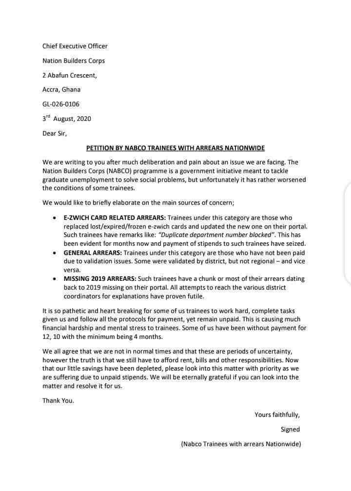 NABCO Trainees With Arrears Nationwide Petition The C.E.O