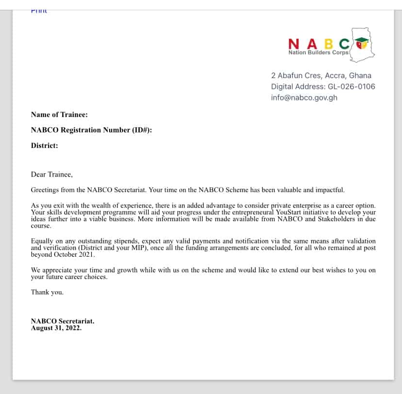 As the NABCO programme is about to come to an end (1st September 2022), The NABCO secretariat has come out with a new notice stating the way forward for all active trainees on the programme. All trainees are hereby advised to login into their portal and check their transition notice.