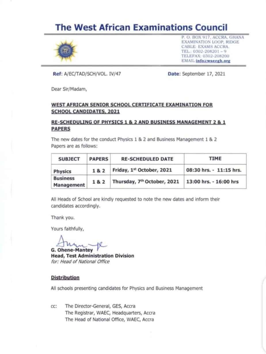 The management of the West Africa Examination Council has released the new dates for the writing of Physics and Business Management papers 1 & 2. This became necessary following the cancellation of these two said papers on the 15th of September 2021.