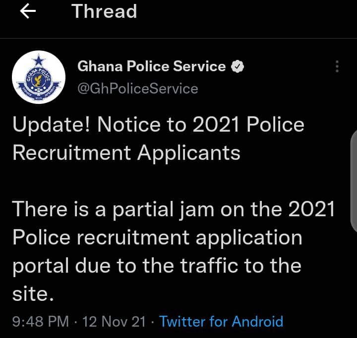 There is a partial jam on the 2021 Police recruitment application portal due to the traffic to the site.