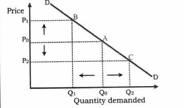 - In the diagram below, P0 and Q0 are the original prices and quantity demanded respectively. When the price increases to P1 quantity demanded falls to Q1 and when the price falls to P2, quantity demanded rises to Q2.