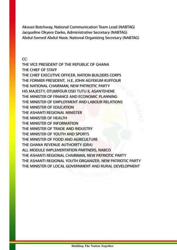 With much appreciation for the timely intervention of NABCO to help address youth unemployment which has proven beyond doubt to be a well-thought-out policy belonging to one of the flagship programs under your administration, the executives of NABTAG has resolved to put measures in place to effect retention of the NPP for the nation-building journey to continue securing the future of the youth.
