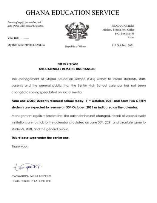 - SHS Students New Reopening Date & Academic Calendar For 2021/2022