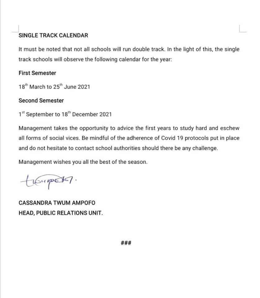 As per the new academic, first-year students in some schools will run a double-track calendar. Even though they are all reopening together, the management of various schools will inform students of their various tracks while on campus. The list of double-track schools will be uploaded on our website www.ges.gov.gh in due course.