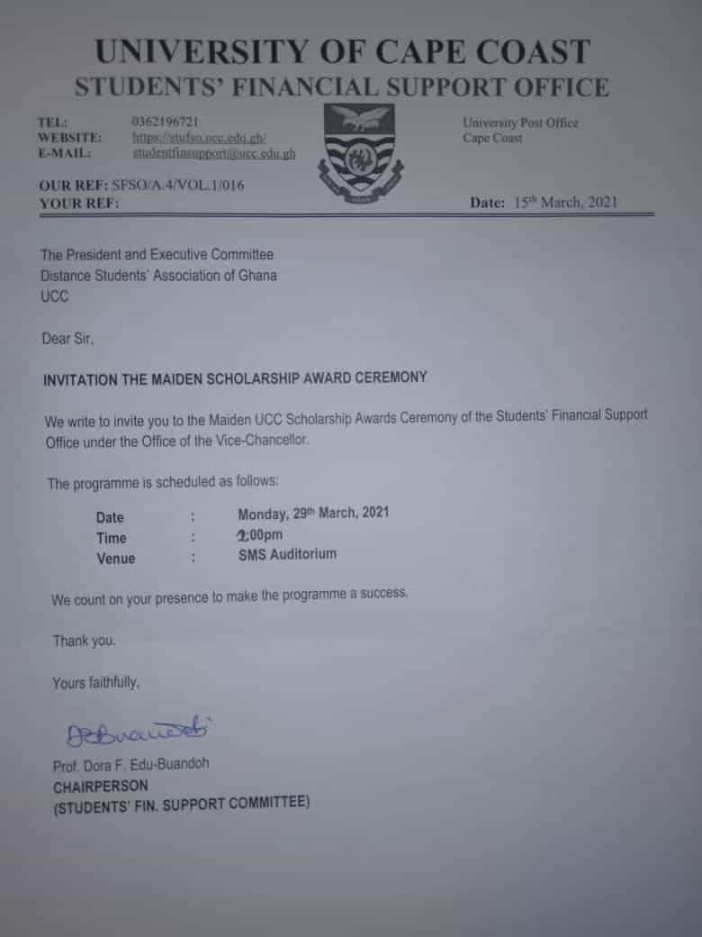 We write to invite you to the maiden UCC Scholarship Awards Ceremony of the student’s financial Support Office under the Office of the Vice-Chancellor.