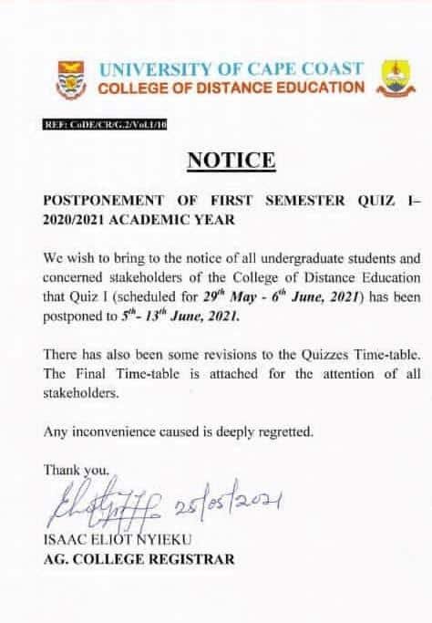The management of the University of Cape Coast (UCC) – College of Distance Education wishes to bring to the attention of all the undergraduate students and the general public the postponement of the first semester Quiz 1.