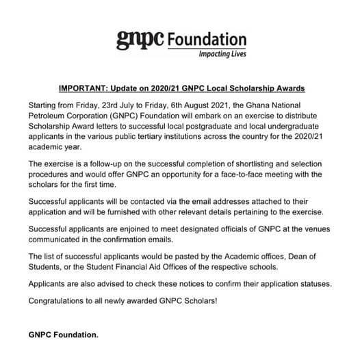 Starting from Friday, 23rd July to Friday 6th August 2021, the Ghana National Petroleum Corporation (GNPC) Foundation will embark on an exercise to distribute scholarship award letters to successful local postgraduates and local undergraduate applicants in the various public tertiary institutions across the country for the 2020/2021 academic year.