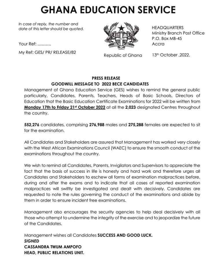 The Management of Ghana Education Service (GES) wishes to remind the general public particularly, Candidates, Parents, Teachers, Heads of Basic Schools, Directors of Education that the Basic Education Certificate Examinations for 2022 will be written from Monday 17th to Friday 21st October 2022 at all the 2,023 designated Centres throughout the country.