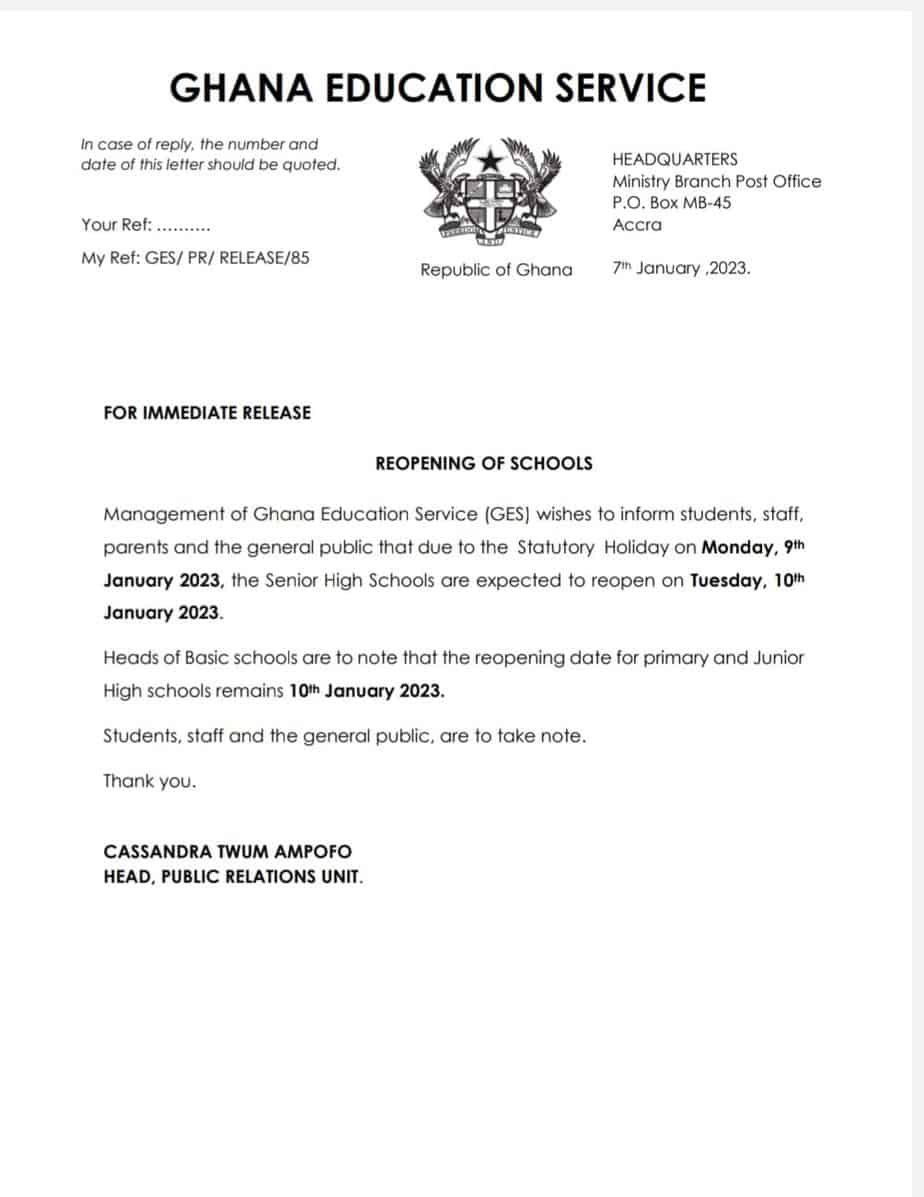 Management of Ghana Education Service (GES) wishes to inform students, staff, parents, and the general public that due to the Statutory Holiday on Monday, 9th January 2023, the Senior High Schools are expected to reopen on Tuesday, 10th January 2023.