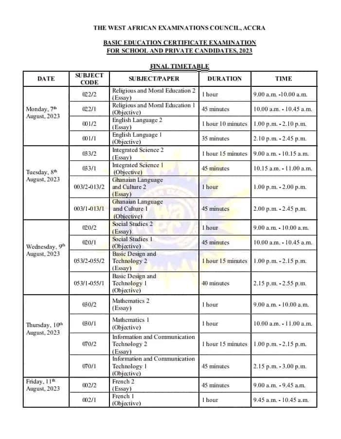 The 2024 BECE Timetable is not yet out. But You can download the 2023 BECE timetable, both the PDF and image, from the link here. We shall upload the 2023 Timetable on this page when it’s released by WAEC.